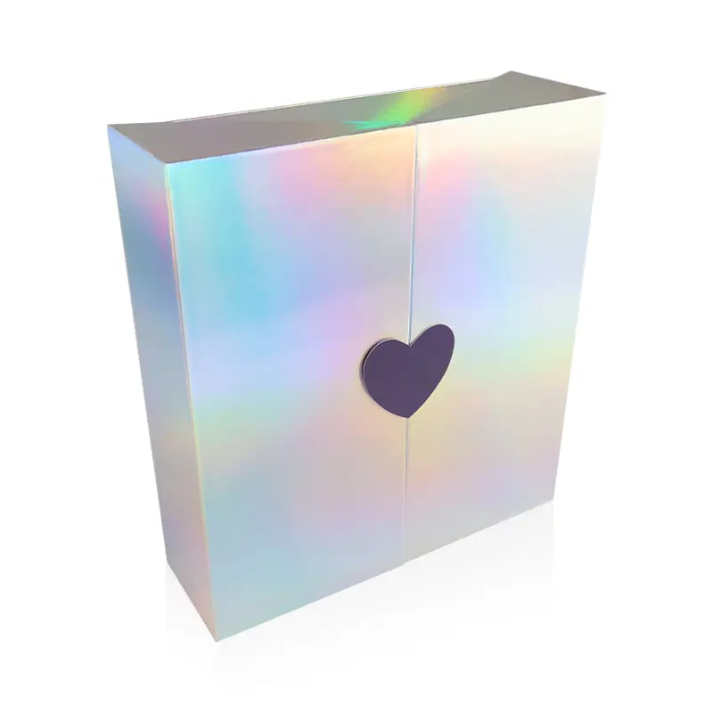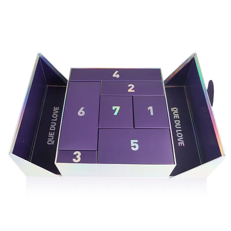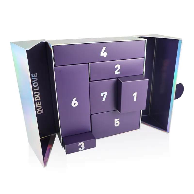 Premium book-style advent calendar box with iridescent outer wrap, purple interior, and seven numbered drawers (1–7). Built for custom printing and structural customization—brand text shown in images is example artwork only.
